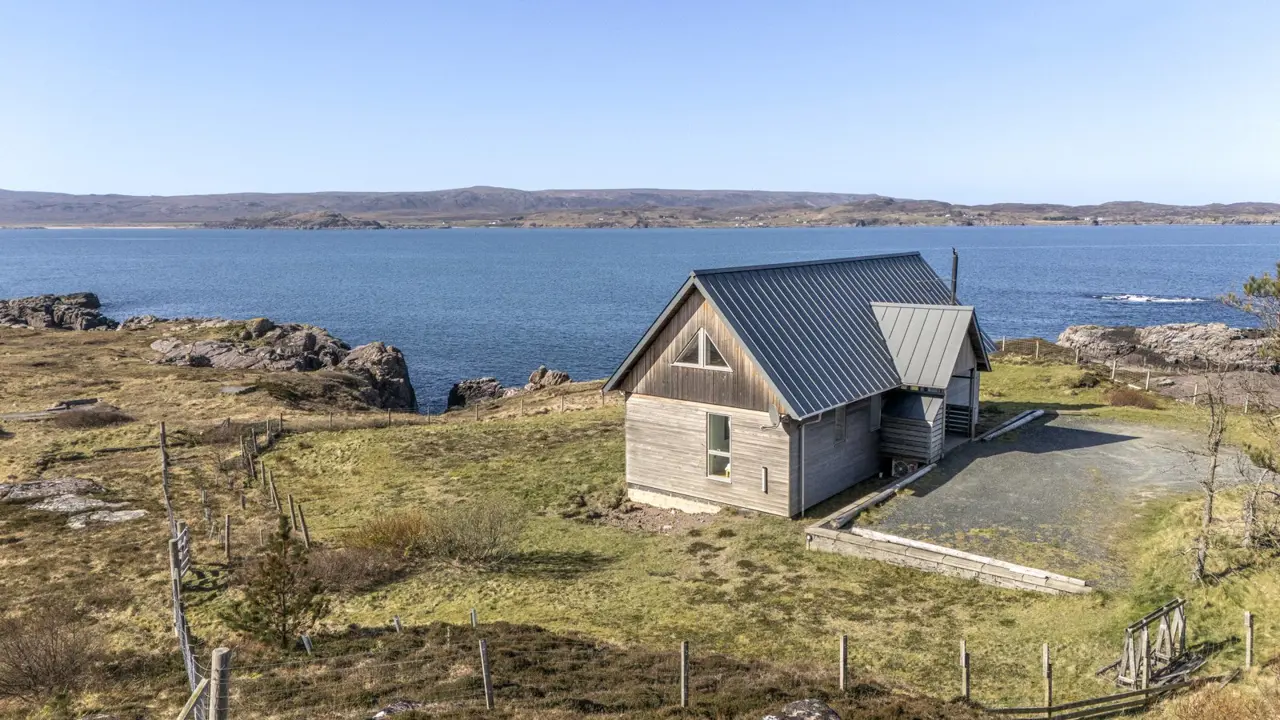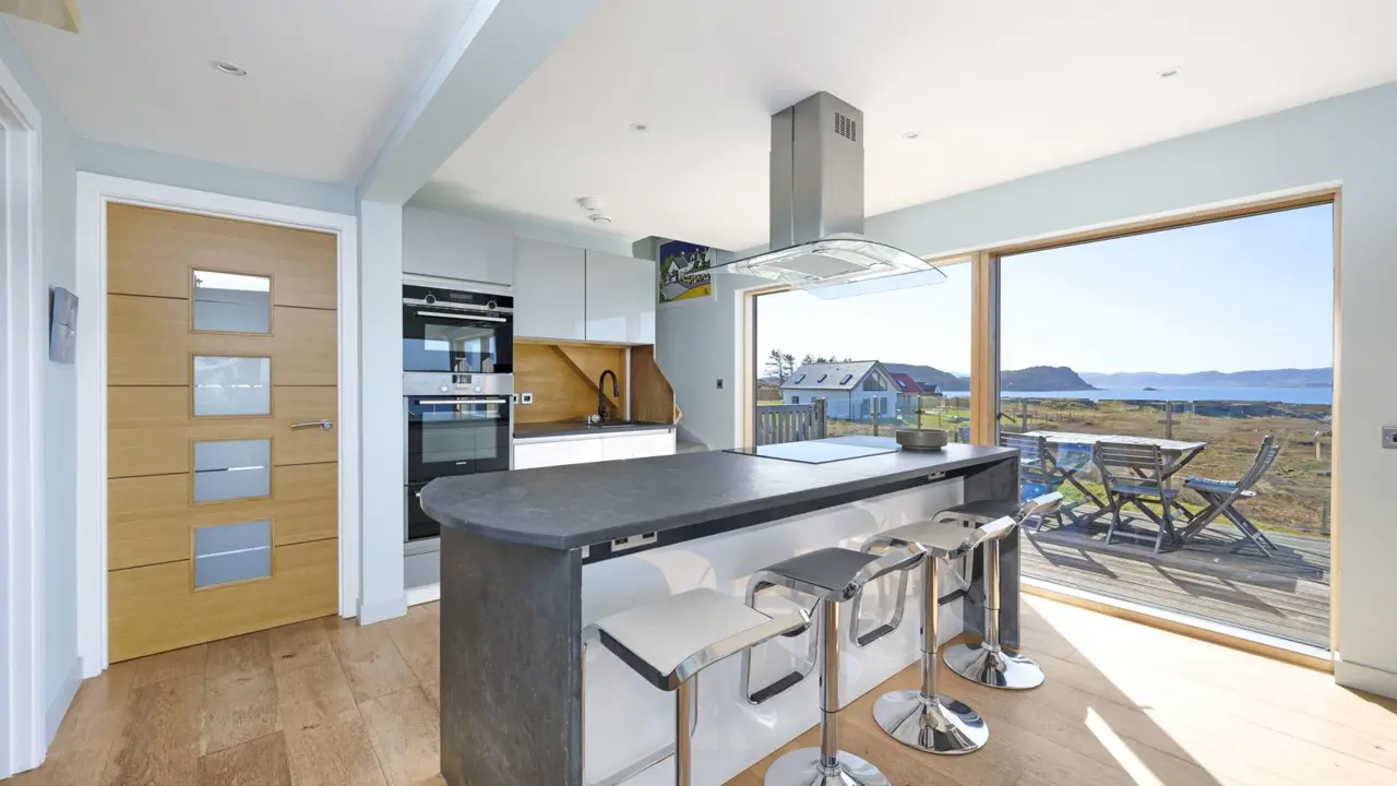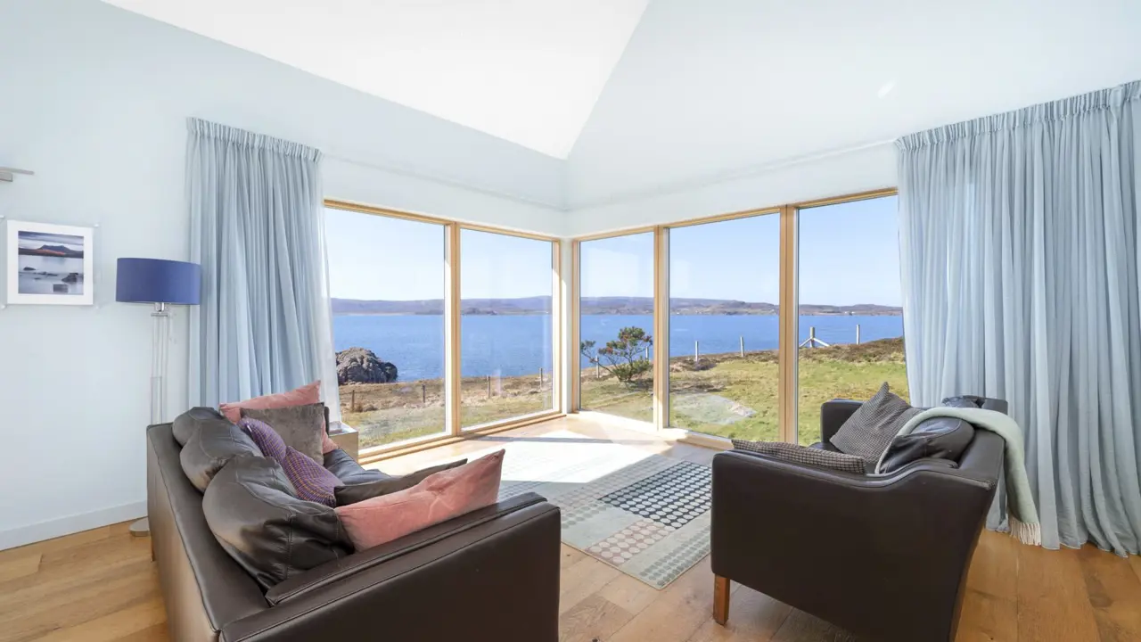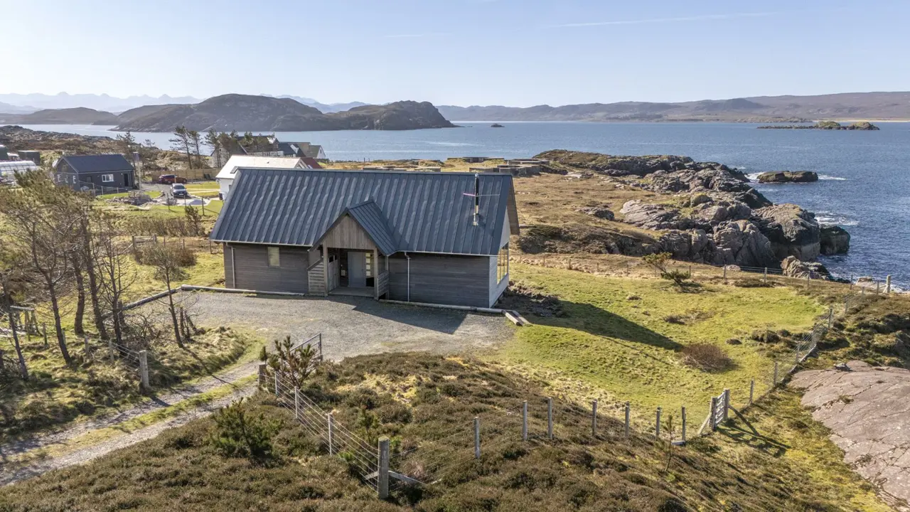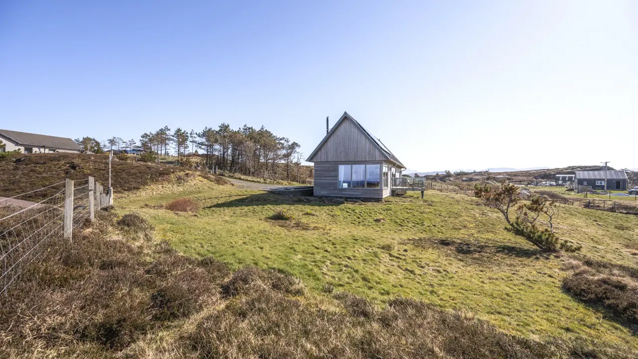 Boom House is in a beautiful setting on the northeast side of Loch Ewe in the scattered crofting village of Mellon Charles. The nearby village of Aultbea lies on the west shore of the loch and has a good range of amenities including a village shop, doctor’s surgery, garage and hotel and bar. There is a primary school at Bualnaluib, 1.5 miles from Mellon Charles, and secondary schooling is in Gairloch about 15 miles away and for which there is a free bus service. Further shops and amenities are available in Poolewe, Gairloch, Ullapool and Dingwall, with Inverness some 78 miles distant having all the facilities of a major city, including its airport with regular flights to the south and Europe.Boom House, designed by architect Robin Haddow, was completed in 2013 and has been under the same ownership since new. An energy efficient property with high levels of insulation, an air source heat pump, a mechanical ventilation with heat recovery system (MVHR), solar panels with a feed-in-tariff, and with an abundance of glazing maximising solar gain. Boom House has many contemporary design elements include larch cladding, steel roofing, a corner window and a mezzanine with glass balustrade mirroring the glass balustrade surrounding the external raised timber deck accessed by a glazed sliding door, ensuring uninterrupted views from the kitchen. The kitchen has integral appliances, a work island/breakfast bar and is open plan with the dining /sitting area with its vaulted ceiling, wood burning stove, and large windows which flood the space with costal light and take full advantage of the views over Loch Ewe and beyond. Loch Ewe has an interesting history, and the name ‘Boom House’ is a nod to the boom net which was run across the entrance of Loch Ewe in World War II to protect the naval fleet on the sea loch from German submarines.