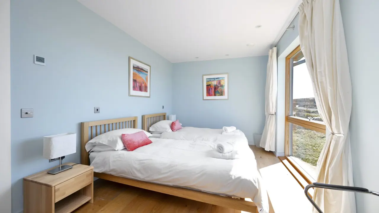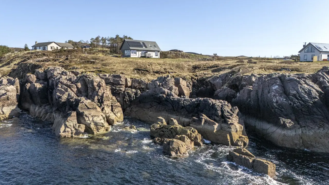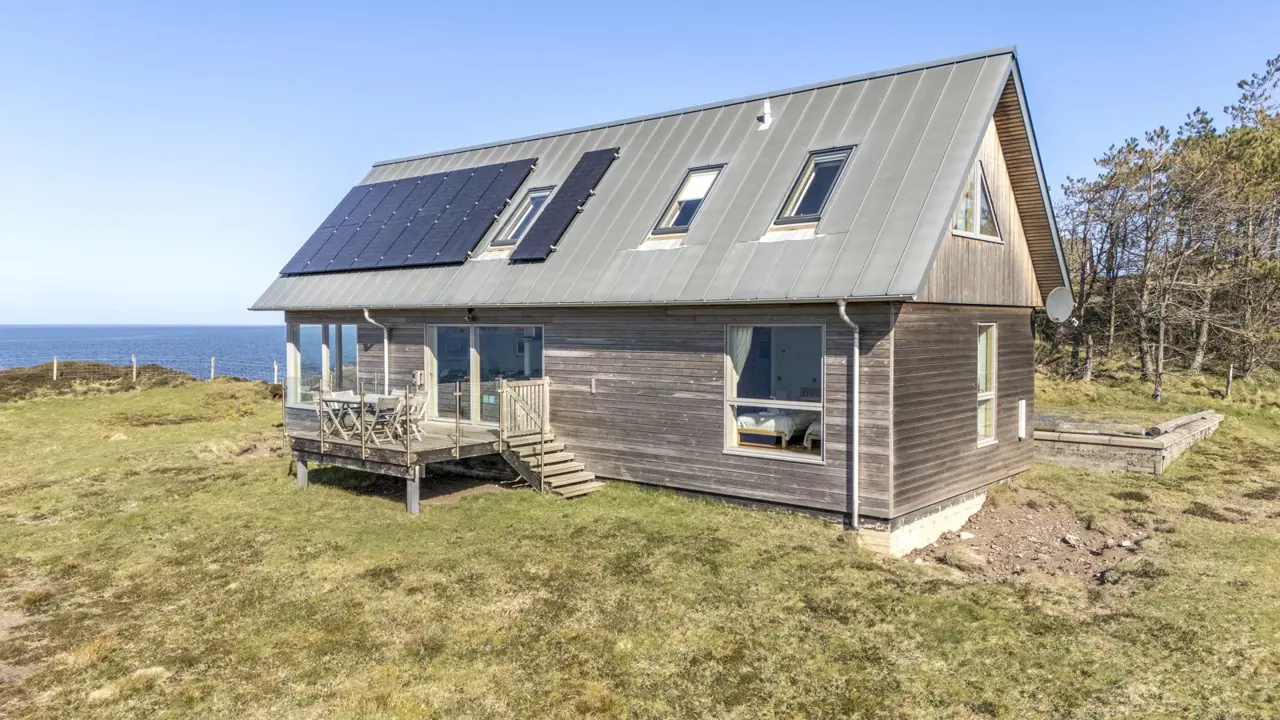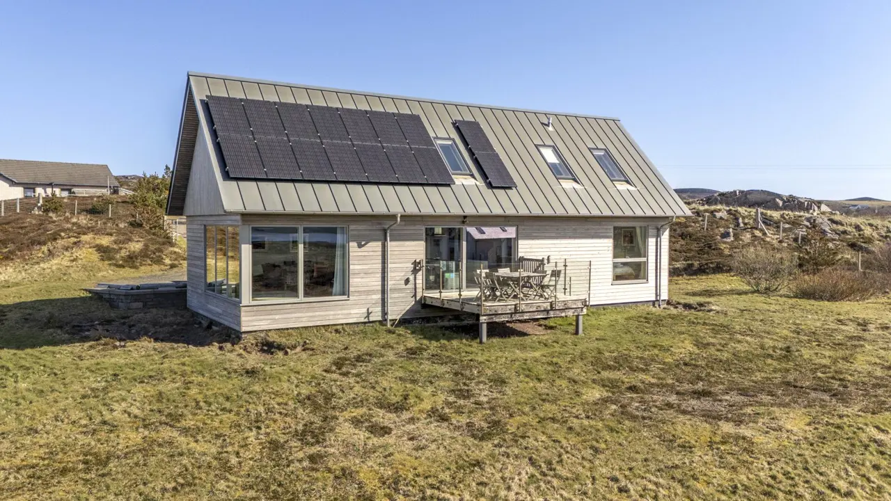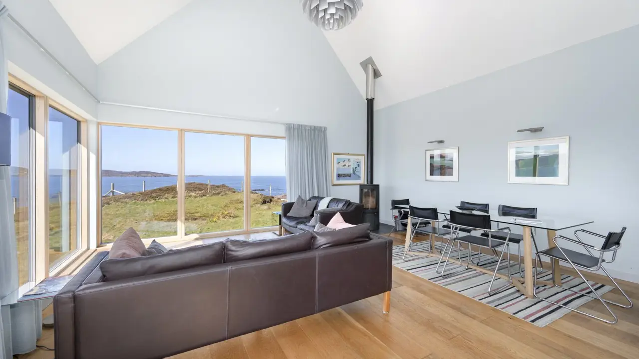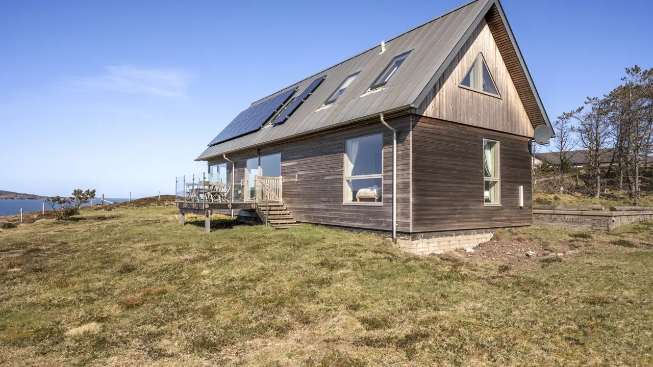 Boom House is in a beautiful setting on the northeast side of Loch Ewe in the scattered crofting village of Mellon Charles. The nearby village of Aultbea lies on the west shore of the loch and has a good range of amenities including a village shop, doctor’s surgery, garage and hotel and bar. There is a primary school at Bualnaluib, 1.5 miles from Mellon Charles, and secondary schooling is in Gairloch about 15 miles away and for which there is a free bus service. Further shops and amenities are available in Poolewe, Gairloch, Ullapool and Dingwall, with Inverness some 78 miles distant having all the facilities of a major city, including its airport with regular flights to the south and Europe.Boom House, designed by architect Robin Haddow, was completed in 2013 and has been under the same ownership since new. An energy efficient property with high levels of insulation, an air source heat pump, a mechanical ventilation with heat recovery system (MVHR), solar panels with a feed-in-tariff, and with an abundance of glazing maximising solar gain. Boom House has many contemporary design elements include larch cladding, steel roofing, a corner window and a mezzanine with glass balustrade mirroring the glass balustrade surrounding the external raised timber deck accessed by a glazed sliding door, ensuring uninterrupted views from the kitchen. The kitchen has integral appliances, a work island/breakfast bar and is open plan with the dining /sitting area with its vaulted ceiling, wood burning stove, and large windows which flood the space with costal light and take full advantage of the views over Loch Ewe and beyond. Loch Ewe has an interesting history, and the name ‘Boom House’ is a nod to the boom net which was run across the entrance of Loch Ewe in World War II to protect the naval fleet on the sea loch from German submarines.