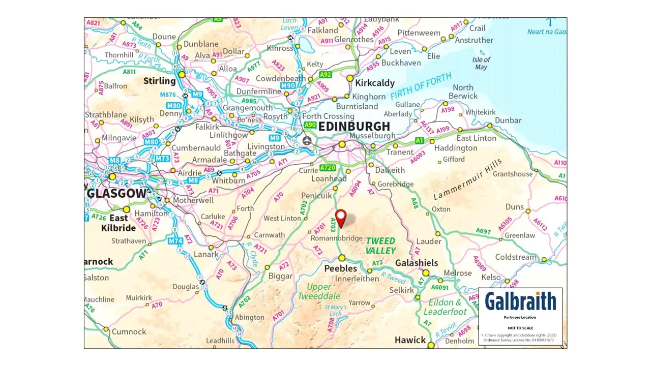 SituationPortmore Estate is situated in a most private and highly scenic rural setting, a short distance from the village of Eddleston and about 5 miles to the north of Peebles in the Scottish Borders. Eddleston is a delightful conservation village with a thriving community with a primary school, village hall and the Horseshoe Inn. The historical Royal Burgh of Peebles, on the River Tweed, offers an extensive range of services including independent retailers, supermarkets, banks, medical centre and both primary and secondary schools.Portmore Estate is highly commutable to Edinburgh. Situated some 18 miles to the north of Portmore, with the city centre reached in about a 45 minute journey by car, Edinburgh offers a wealth of amenities including a wide variety of retail outlets, restaurants, museums, art galleries and 3 universities. Home to the Edinburgh Festival and the Fringe, the city has numerous theatre and concert hall venues. Its international airport reaches destinations throughout Europe and North America, whilst the Waverley Railway Station provides daily services north and south including the London Sleeper service. Edinburgh has a number of independent schools offering both primary and secondary schooling. St Mary’s Preparatory School is found at Melrose, lying about 29 miles to the south-east.The Scottish Borders is a county of gentle rolling countryside comprising fertile arable land, grassland, woodlands and hills, with the Tweed river system running through it, renowned for its excellent salmon fishing. The county has had a vibrant history including that of the Border Reivers and associated fortresses and castles and was renowned for its great woollen textile industry which still forms a major contribution to the local economy. The county offers a wealth of recreational activities including shooting, fishing, hill walking, mountain biking and for the golfer, a number of excellent courses including the Peebles Golf Club. The Scottish Borders has a strong equestrian identity which continues today with racing at Kelso. There are also Rugby Clubs in a number of the local towns. The nationally renowned Borders Book Festival, which has been running for 20 years, is hosted annually in Melrose.DescriptionPortmore Estate is a highly desirable Scottish Estate extending to some 3,459 acres (1,400 hectares). Centred on Portmore House, a Category A-Listed country house, the estate sits within beautiful and well-tended policies with restored walled garden and Victorian glasshouse, a parterre, parkland fields, mature deciduous woodlands, farmland and hill ground, together with the reservoir to the north. The estate provides great seclusion and amenity, nestled discreetly in the rolling Borders countryside. The farming enterprise is run from Boreland Farm, which lies to the south of Portmore House and includes a farmhouse, cottage and practical range of modern and traditional farm buildings. The highly regarded pheasant shoot, which ran for many years, has very recently ceased following the retirement of the keeper. In addition to a lower ground floor flat within Portmore House, there are five further residential dwellings on the estate; Primrose Cottage (Gardener’s House), Hillhead Cottage (Keeper’s House), Portmore Lodge and both 1 & 3 Skiprig CottagesMethod of SalePortmore Estate is presented in 3 Lots. However, it is only available to purchase in the following packages:-• Lot 1• Lot 1 & 2• As whole (Lots 1, 2 & 3)Please note that Lots 2 and 3 are not available to purchase individually or as Lots 1 & 3 together.Lot 1Portmore House, Portmore Lodge, Primrose Cottage, Hillhead Cottage and Land (Extending in total to 274 acres, 111 hectares)Portmore HousePortmore House is a Category A-Listed Scots baronial house built in 1850 and designed by the Scottish architect, David Bryce. Constructed of red sandstone under a principally slated roof with lead additions, it has a central tower together with turrets on the western elevation, crow step gables and sash and case windows. The South Wing was partially rebuilt following a fire in the 1980s. Portmore House offers well-proportioned rooms which are light and bright with a wealth of period of features including wood panelling, fine cornicing, panelled doors and fireplaces and the original organ in the hall.Portmore House provides beautiful principal reception rooms and extensive bedroom accommodation with a most welcoming kitchen with practical ancillary rooms. The accommodation extends to a billiard room on the lower ground floor, a playroom and a 2-bedroomed caretaker’s flat. Adjoining the principal house is a practical range of outbuildings lying to the north with a partly covered cobbled courtyard adjacent. The accommodation of Portmore House lies over three principal floors comprising:-Ground Floor: Hall, Organ Room, Drawing Room, Library, Dining Room, Kitchen, Sitting Room, Pantry, Laundry, Cloakroom, Boot room, Ancillary Room, Annex Bedroom Wing (2 Bedrooms and Shower Room)First Floor: Principal Bedroom Suite with Dressing Room, Bathroom, Walk in Wardrobe, Shower Room, Store Cupboard, Bedroom 2 with En-suite, Bedroom 7 with En-suite, 7 further Bedrooms, 5 further Bathrooms.Reached by a secondary staircase from the Ancillary Room on the ground floor is a Guest Annex providing Sitting Room, Bedroom, BathroomSecond Floor: Bedroom 11 Lower Ground Floor: Billiard Room, 5 Bedrooms, Bathroom, Playroom, Cloakroom, Two Wine Cellars, Store Room 1, Boiler Room, Store Room 2, Generator Room, Store Room 3In addition there is a two bedroom flat within Portmore House on the lower ground floor. It can be accessed directly from the lower ground floor and via its own independent access. It provides the following accommodation: Hall, Store Room, Sitting Room, Kitchen, Snug/Study, Bedroom 1 with En-suite Shower Room, Bedroom 2, Bathroom.Gardens and GroundsThe gardens at Portmore are a notable feature of the estate having been carefully restored 